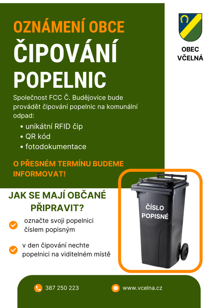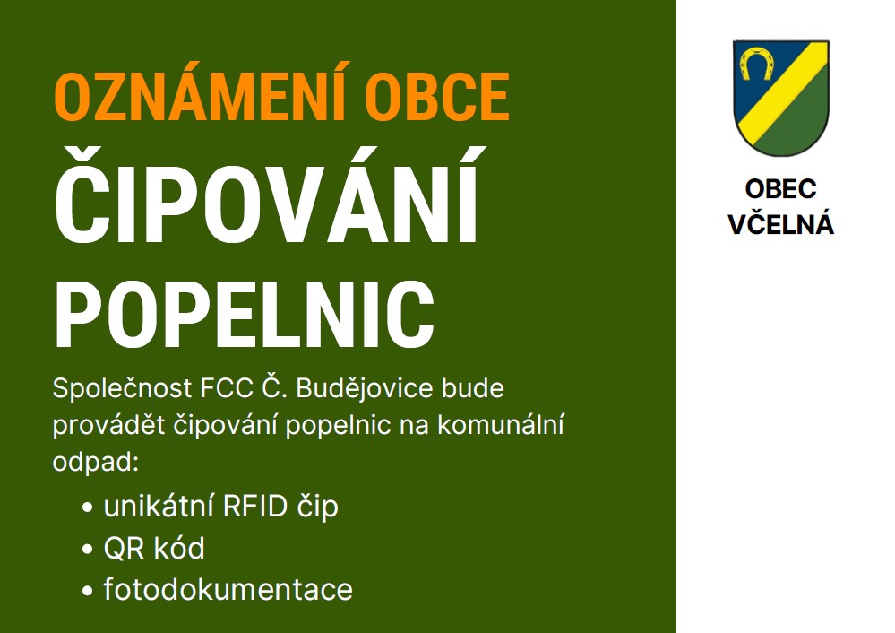 obec Včelná ve spolupráci se společností FCC České Budějovice, s.r.o. zavádí čipování popelnic na komunální odpad.