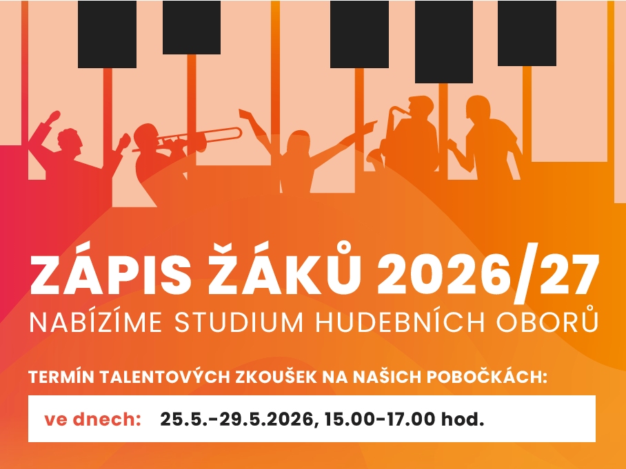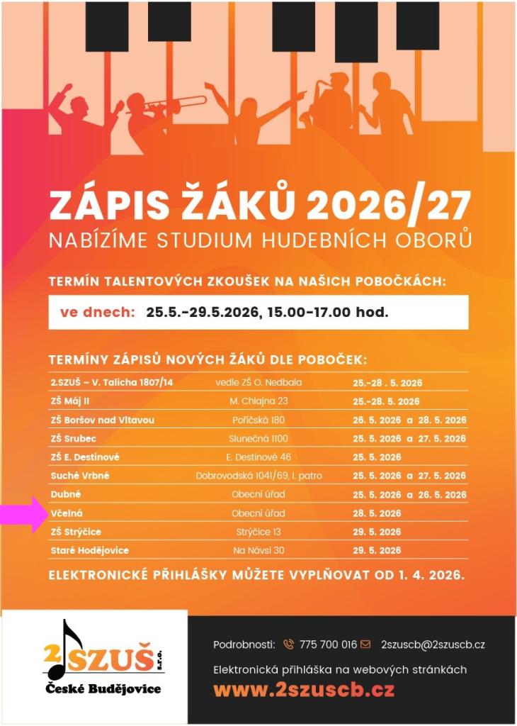 Zápis žáků ke studiu hudebních oborů se koná ve čtvrtek 28. 5. 2026 v učebně ve 2. patře Obecního úřadu Včelná v době 15-17 hodin.