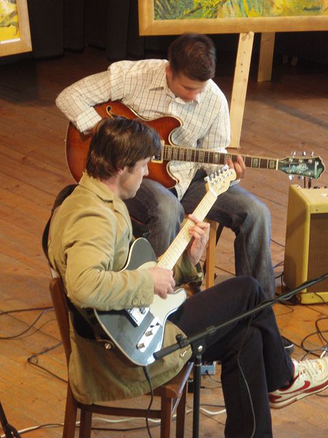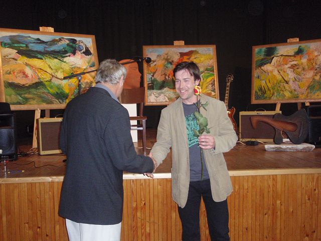Při vernisáži se Petr Schel představil také jako kytarista hudební skupiny Café Noir a autoři i občané Včelné našli společnou řeč při sklenici dobrého francouzského vína.